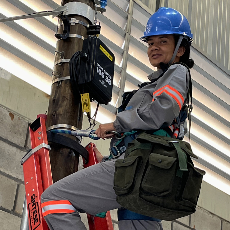 Primeira mulher a trabalhar neste setor da empresa, ela sobe escadas e conserta redes na rua com total desenvoltura, provando que lugar de mulher também é em ambiente técnico, conectando as famílias e negócios mineiros com a nossa internet.